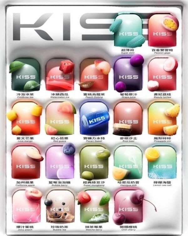 – 多樣口味:KISS煙彈提供多達23種口味選擇,從經典煙草到沁涼薄荷,再到各種水果口味,讓你隨時隨地都能找到最愛的那一款!